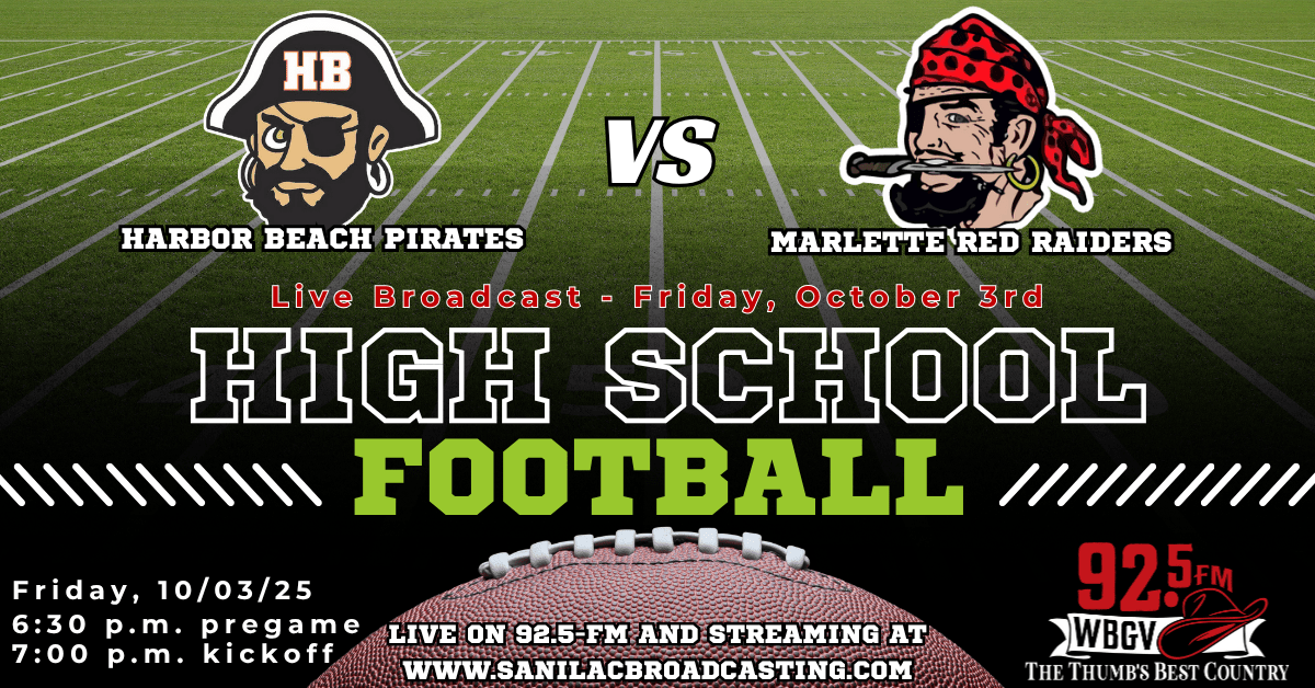 Sanilac Broadcasting Company’s coverage of high school football in the Thumb and Blue Water Area continues into week 6, with our featured game of the week seeing the Harbor Beach Pirates taking on the Marlette Red Raiders. Join Eddie Fury and Jeremy Burgess this Friday, October 3rd. Pre-game coverage begins at 6:30 p.m. with kickoff at 7:00 p.m. on 92.5-FM and streaming live.
