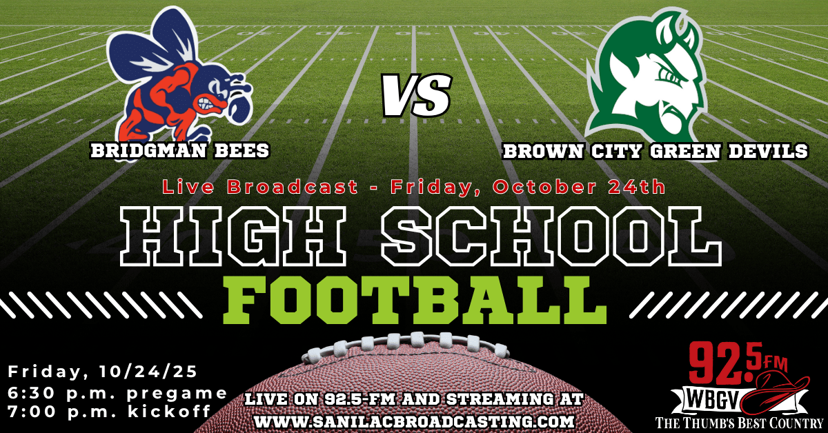 Coverage of high school football in the Thumb continues with week 9, featuring the Bridgman Bees taking on the Brown City Green Devils. Jeremy Burgess and Sean Cantwell bring you all the action, with pre-game coverage beginning at 6:30 p.m., kickoff at 7:00 p.m. on Country 92.5-FM and streaming live.