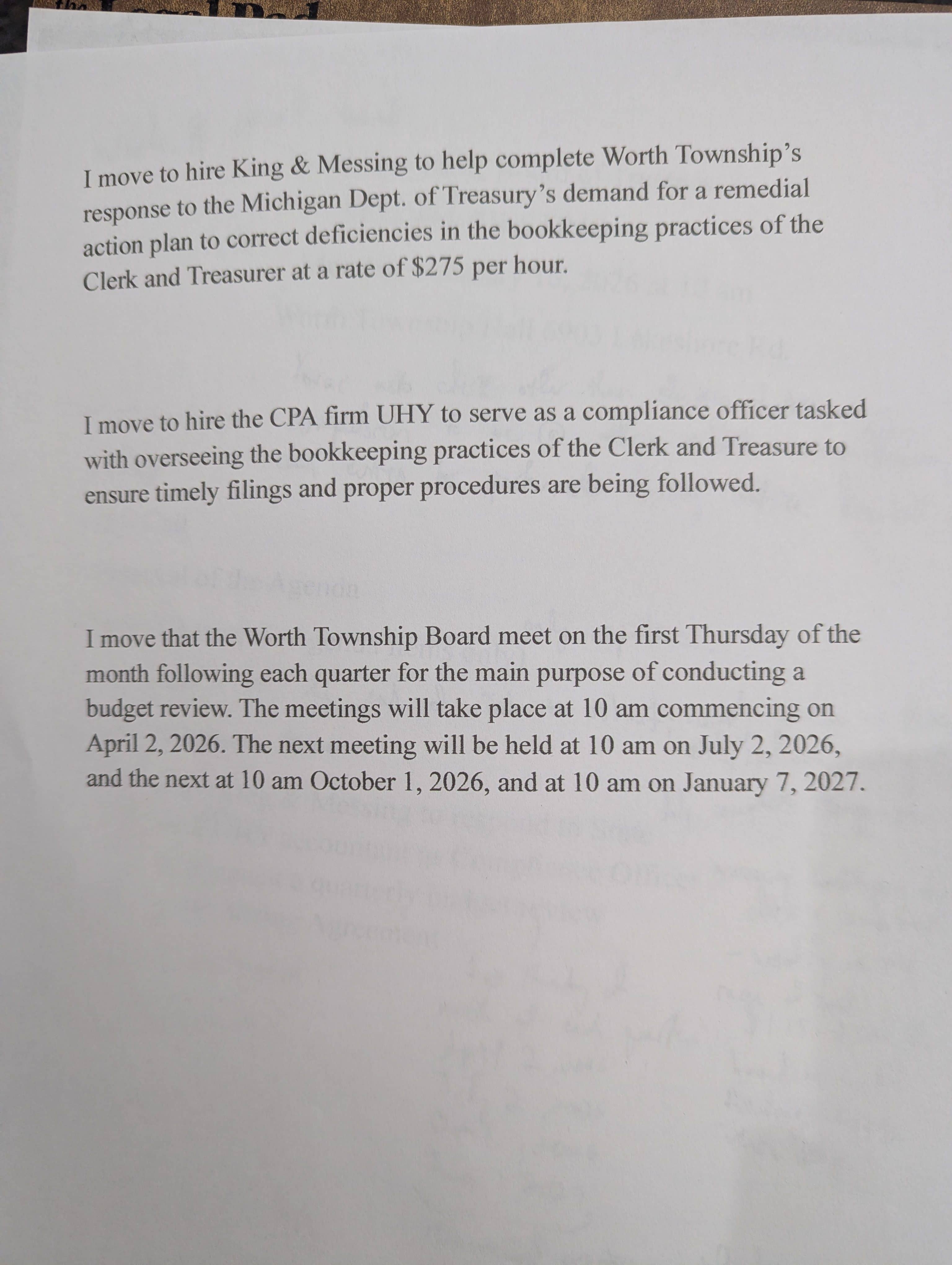 The Worth Township Board of Trustees met Monday morning for a special meeting to implement several changes focused on bringing them into compliance with the state’s treasury. With the township flagged as a problem jurisdiction by the Michigan Department of Treasury following their most recent financial audit, Worth Township moved during a 10 a.m. meeting on Monday, February 16th to hire an accounting firm and implement a quarterly budget review.