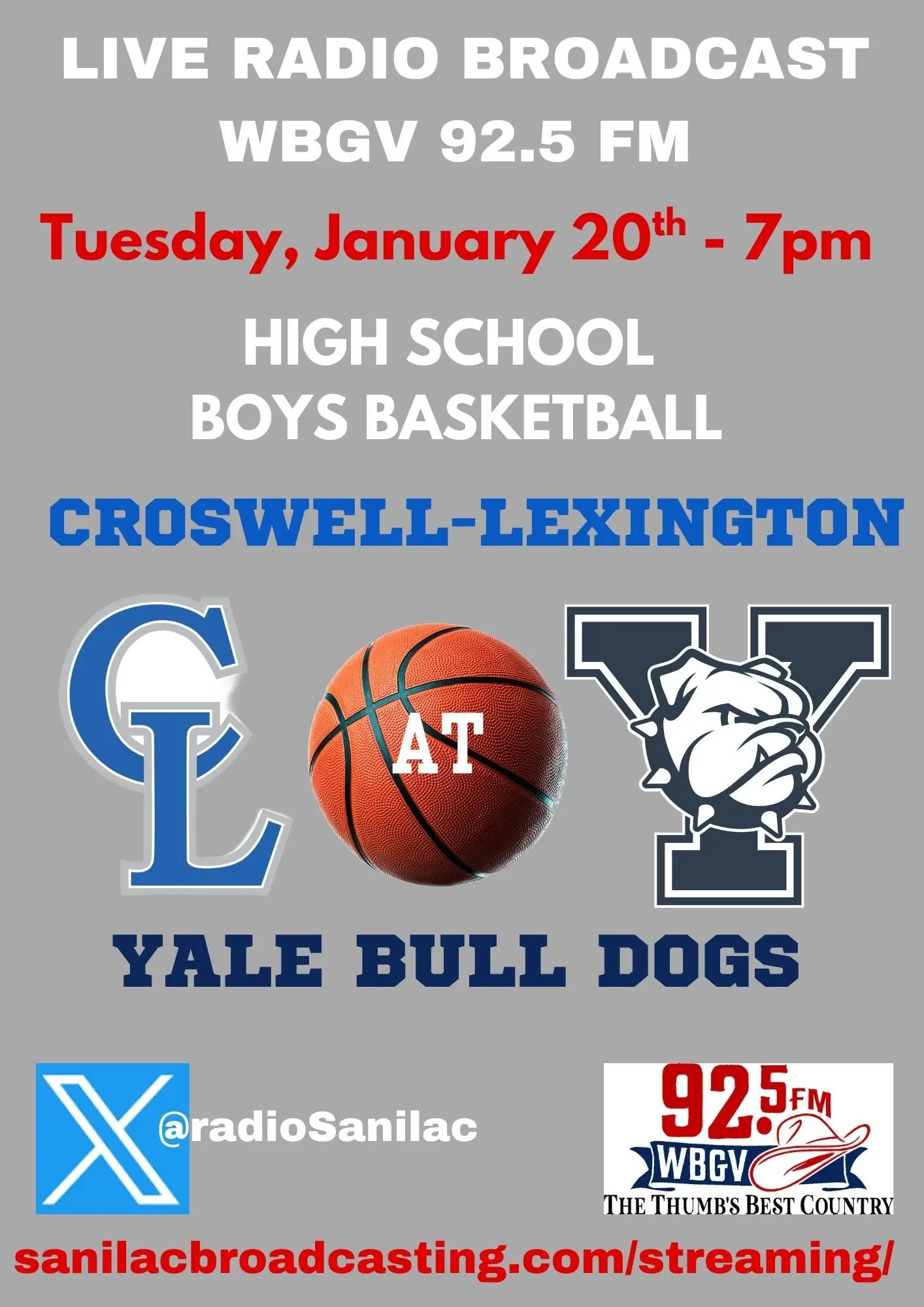WBGV 92.5 FM Radio Replay of the HS Boys Basketball game with Croswell-Lexington at Yale, 1-20-2026. It was a battle for 1st place standing in the Blue Water Area Conference – and it went to overtime as the Cros-Lex Pioneers got the comeback victory 67-54 in the first meeting of the teams of the 2025-26 regular season. Eddie Fury with the play by play.