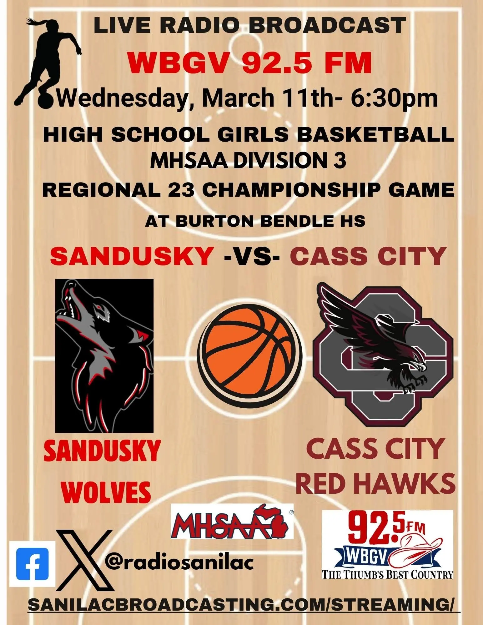 Replay of Sanilac Broadcasting’s coverage of the Thumb-area high school girls’ basketball Division 3 Region 23 Finals, featuring the Sandusky Wolves and the Cass City Red Hawks at Bendle High School in Burton, with Jeremy Burgess and Sean Cantwell bringing you all the action. Cass City gets the victory over Sandusky, 54-30.
