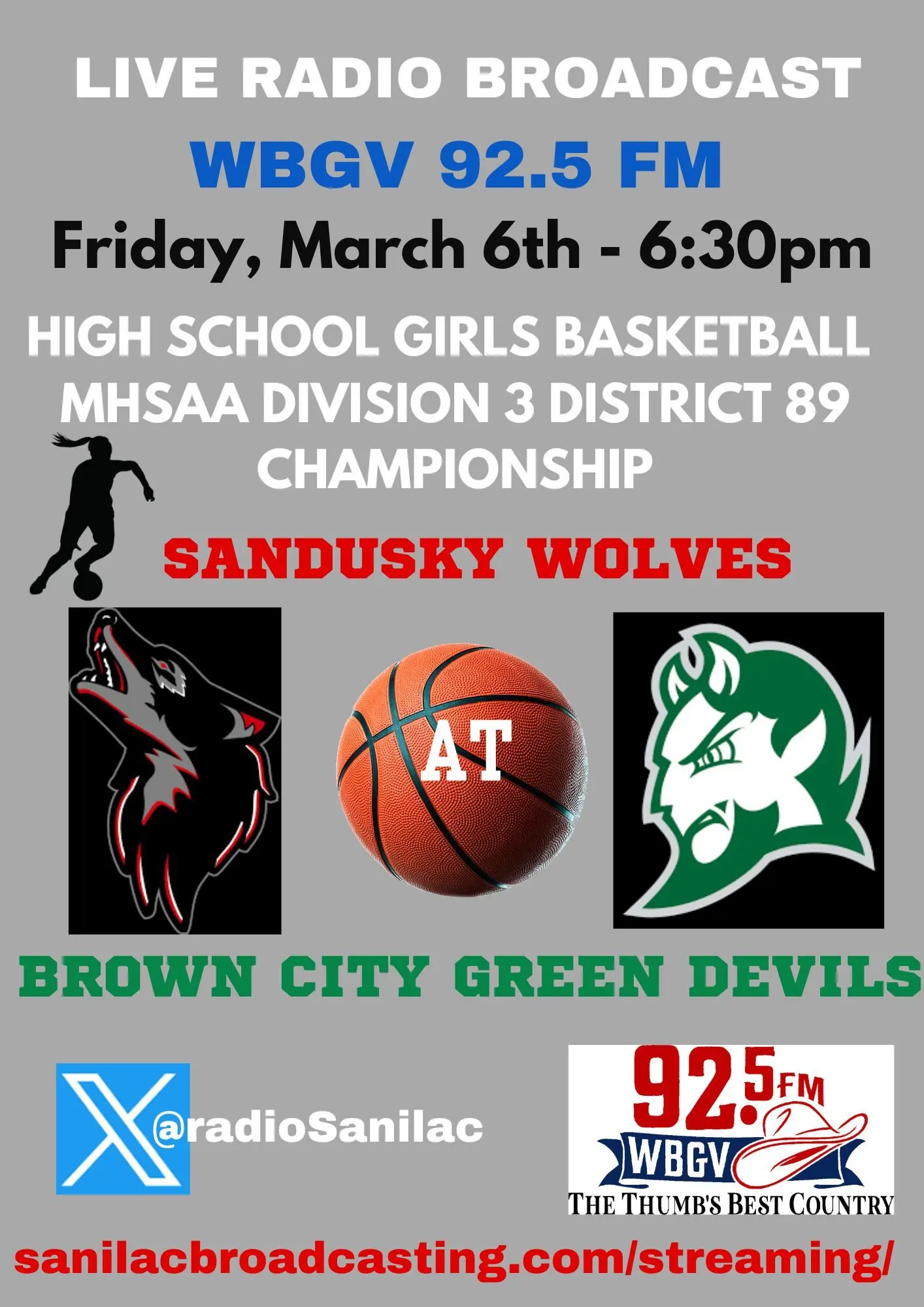 Replay of Sanilac Broadcasting’s coverage of the Thumb-area high school girls’ basketball Division 3 District 89 Championship Game, featuring the Sandusky Wolves and the Brown City Green Devils in Brown City, with Jeremy Burgess and Sean Cantwell bringing you all the action. Sandusky gets the victory over Brown City, 33-29, to advance to the Regional Semifinals.