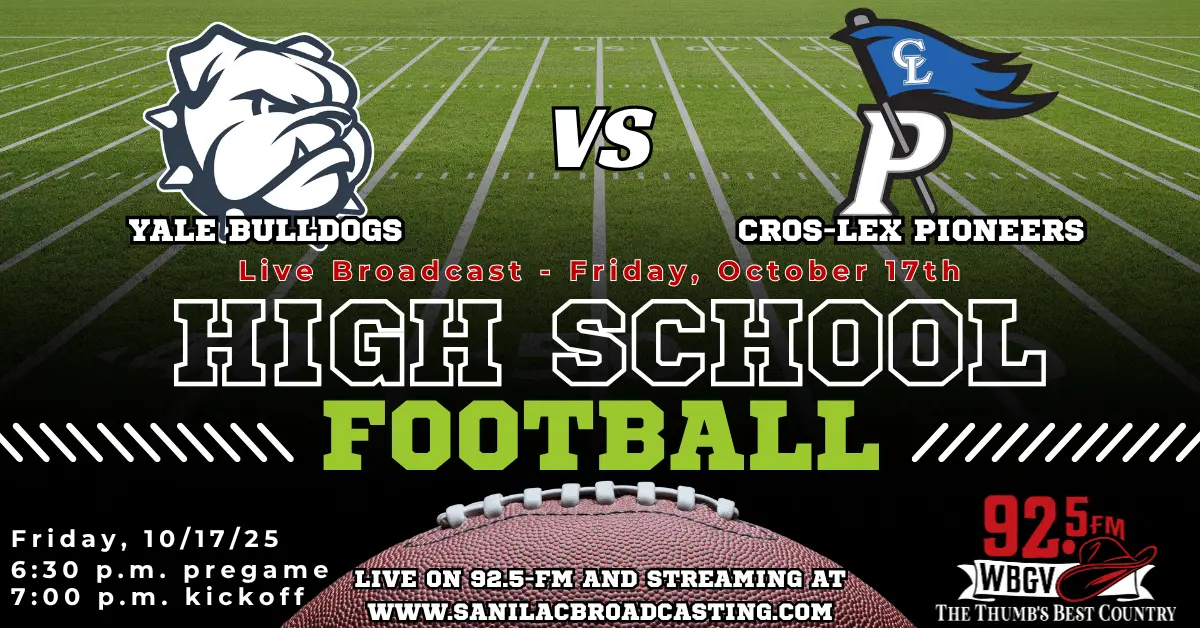 Sanilac Broadcasting’s week 8 coverage of Thumb-area high school football features the Yale Bulldogs taking on the Cros-Lex Pioneers. Eddie Fury and Jeremy Burgess bring you all the action, with pre-game coverage beginning at 6:30 p.m. and kickoff at 7:00 p.m. on Country 92.5-FM and streaming live.